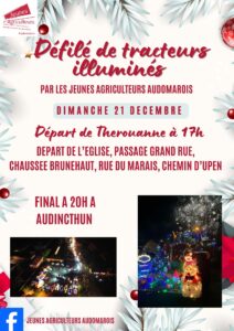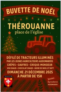 L’Association Thérouanne en Fête organise une Buvette de Noël Place de l’Eglise à Thérouanne à l’occasion du Défilé de Tracteurs Illuminés réalisé par les Jeunes Agriculteurs Audomarois le dimanche 21 décembre 2025 à partir de 15h.